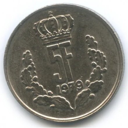Реверс: В центре - обозначение номинала, ниже год чекана. Сверху над номиналом корона, ниже номинала и года изображены две ветви с листьями.