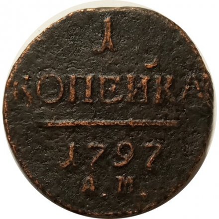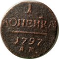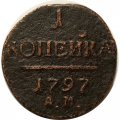 Реверс: В центре надпись — слово «КОПЕЙКА». Над надписью — цифра «1.». Под надписью — прямая черта, под ней — дата выпуска монеты «1797». Под датой обозначение монетного двора "АМ" - Аннинское.