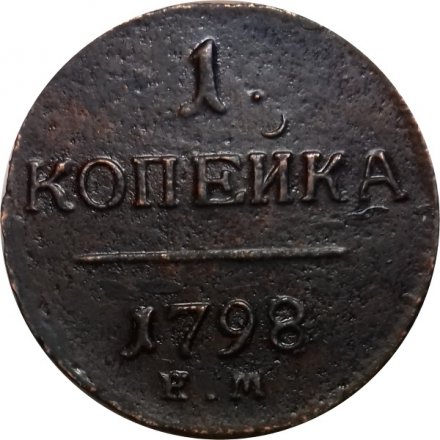 Реверс: В центре надпись — слово «КОПЕЙКА». Над надписью — цифра «1.». Под надписью — прямая черта, под ней — дата выпуска монеты «1798». Под датой обозначение Екатеринбургского монетного двора — буквы «Е.М.».